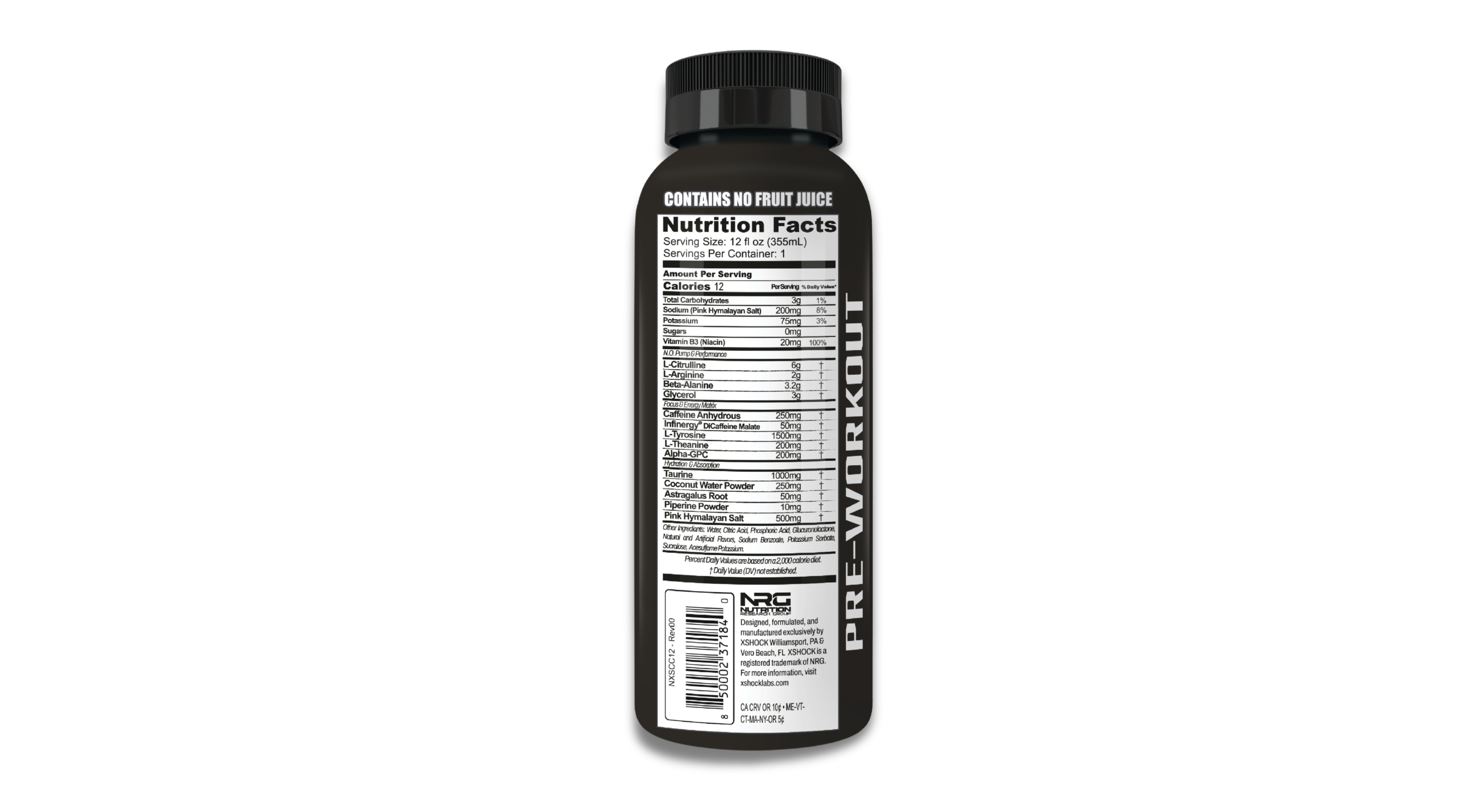 L-citrulline 6 g, L-arginine 2 g, beta-alanine 3.2 g, taurine 1 g, caffeine anhydrous 250 mg, Infinergy™ dicaffeine malate 50 mg, L-tyrosine 1500 mg, L-theanine 200 mg, alpha-GPC 200 mg, glycerol 3 g, coconut water powder 500 mg, pink Himalayan salt 500 mg, Taurine 1 g , niacin (vitamin B3) 20 mg, asparagus root extract 100 mg, and piperine 50 mg.